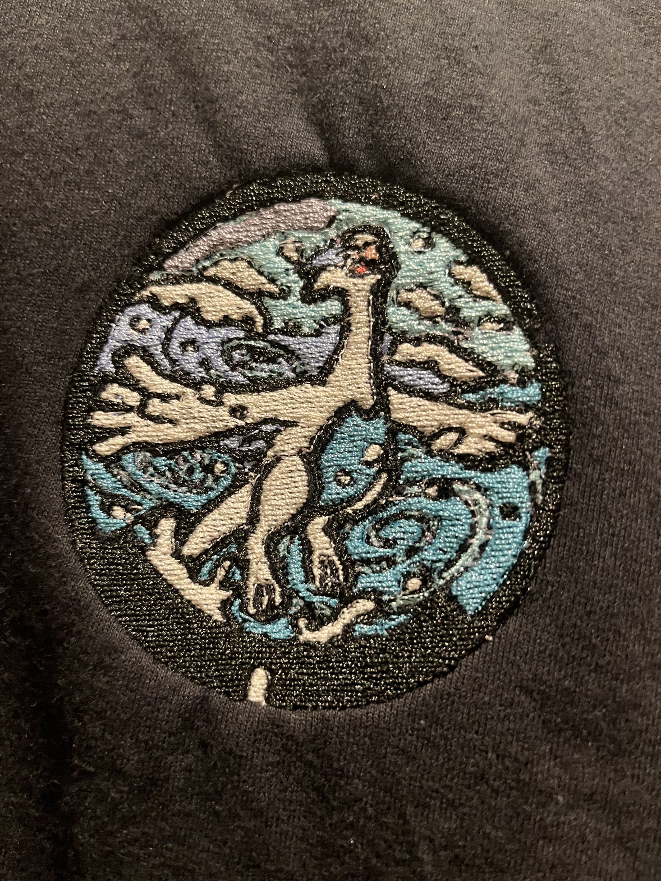 This embroidered design features Lugia in a detailed, circular composition inspired by ocean and sky elements. Lugia is stitched in soft neutral tones with defined outlines, set against swirling waves and cloud-like patterns in shades of blue and teal. The layered stitching creates depth and movement, while the bold circular border frames the artwork for a clean, finished look. High-density embroidery and precise threadwork give the design a durable, textured finish, making it well-suited for shirts, toboggans, and collectible embroidery pieces.